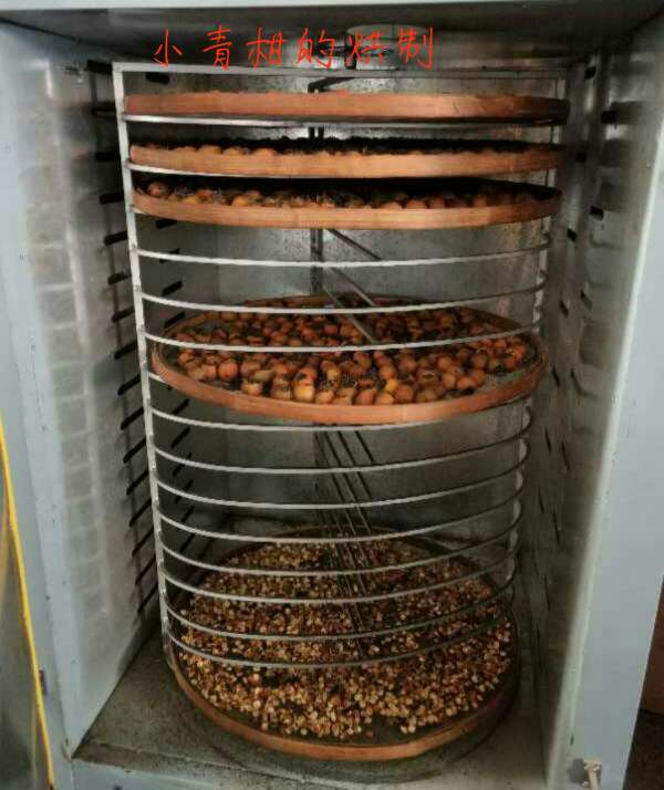 下面的是2018年12月公司用普洱的陳皮與公司的茶葉結(jié)合,制作的小青柑。青柑工藝種類的區(qū)別主要出現(xiàn)在干燥環(huán)節(jié),干燥方式的不同使之形成了不同的風(fēng)味與口感。烘制時間是18個小時,低溫烘焙,采用60℃左右的溫度,將小青柑烘焙至干燥。時間和成本雖有提高,但比起高溫烘焙工藝來說,口感更好,提香適當,兼以保持了活性,為后期轉(zhuǎn)化保留了空間。